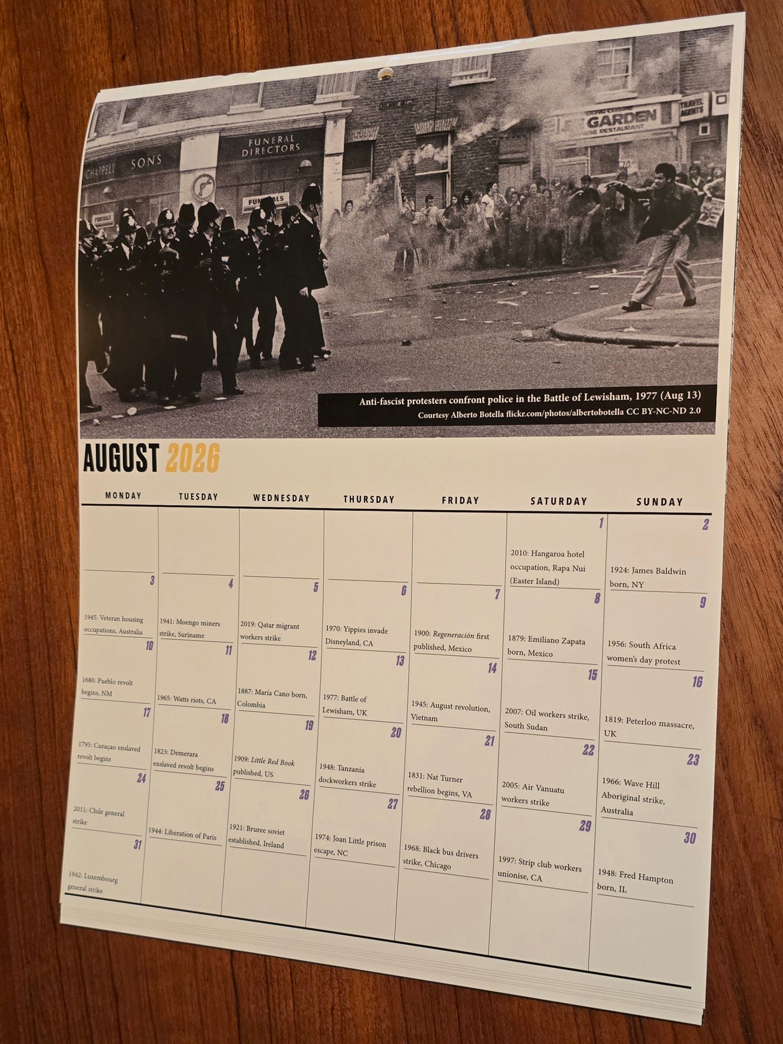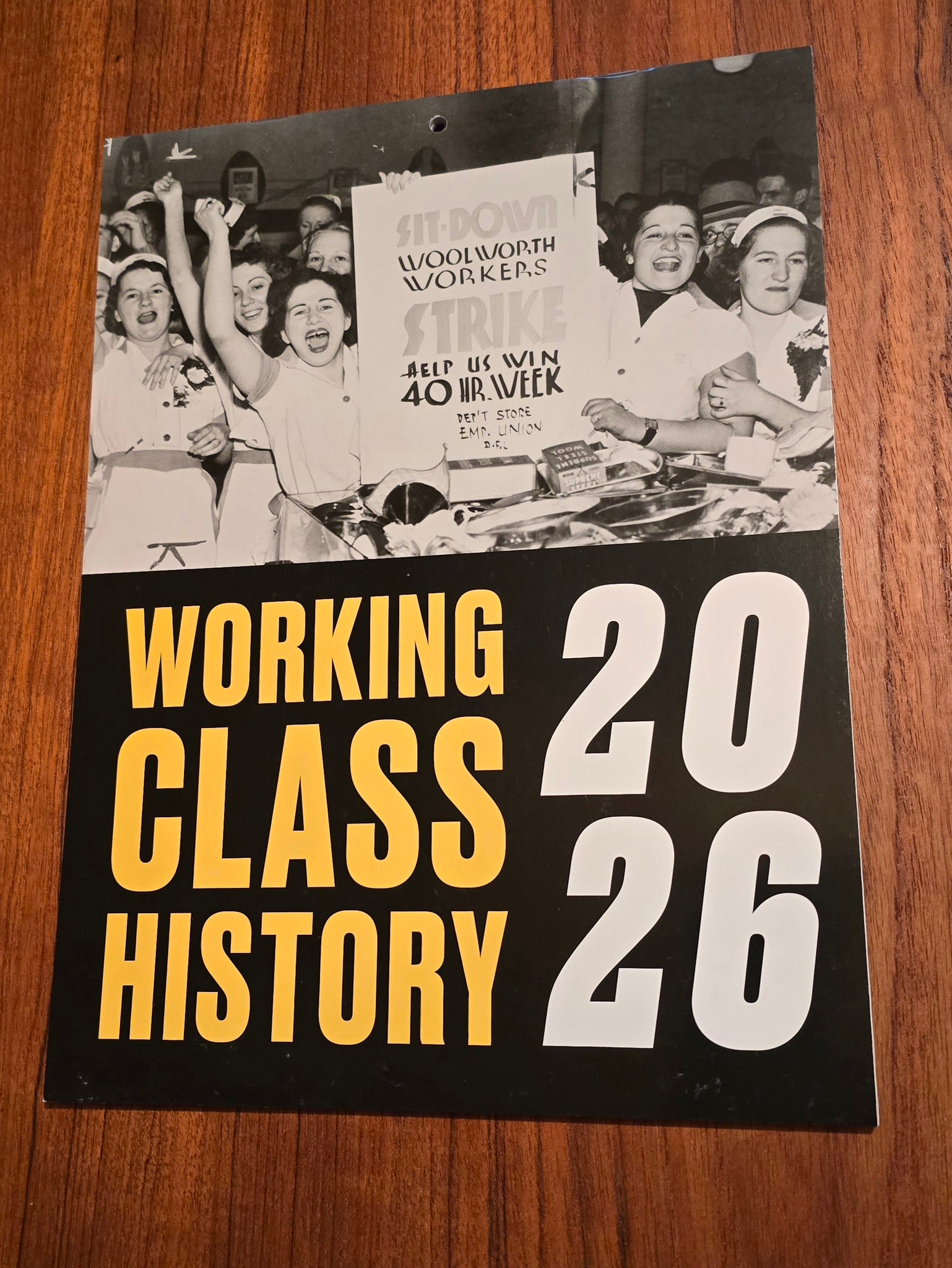 Get your daily dose of people's history with the 2026 Working Class History limited edition wall calendar! 8.5" x 11" (22 x 28 cm), on high quality gloss paper, with an item of On this Day in history each day, alongside photographs of ordinary people who have made history accompanying each month. It also includes room for you to do your own year planning.