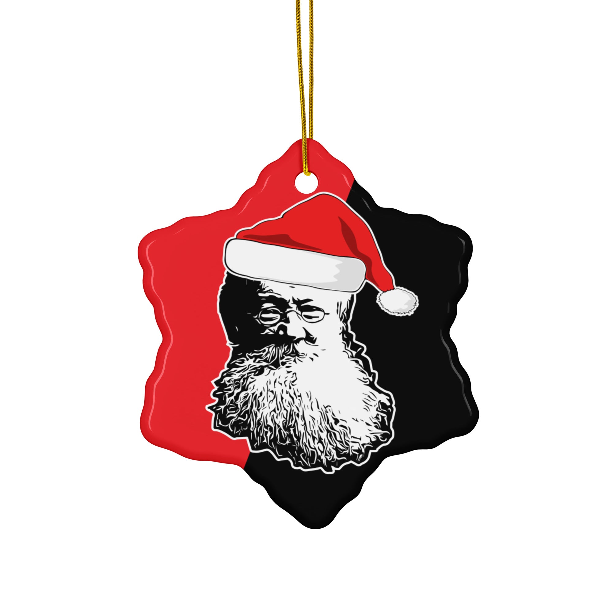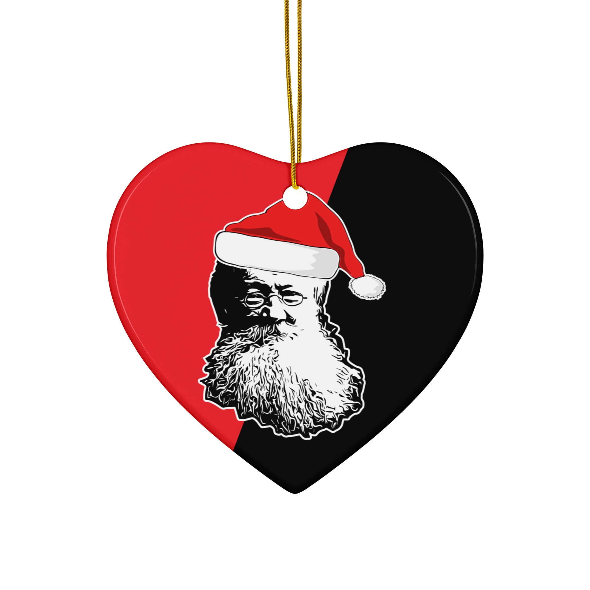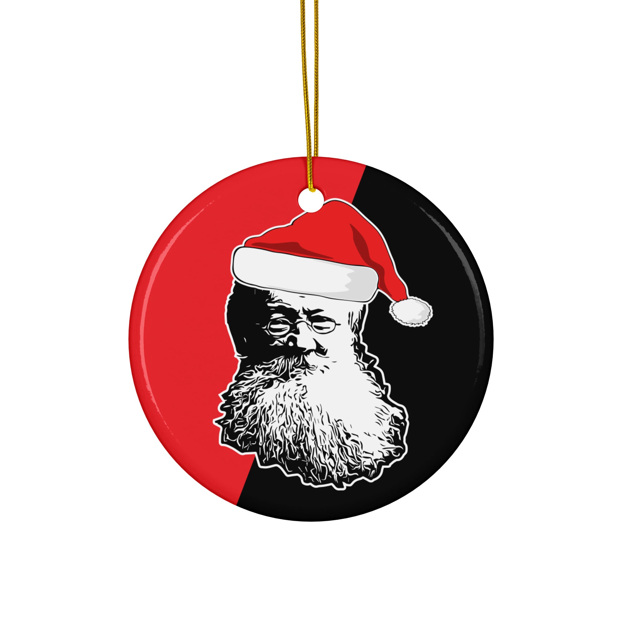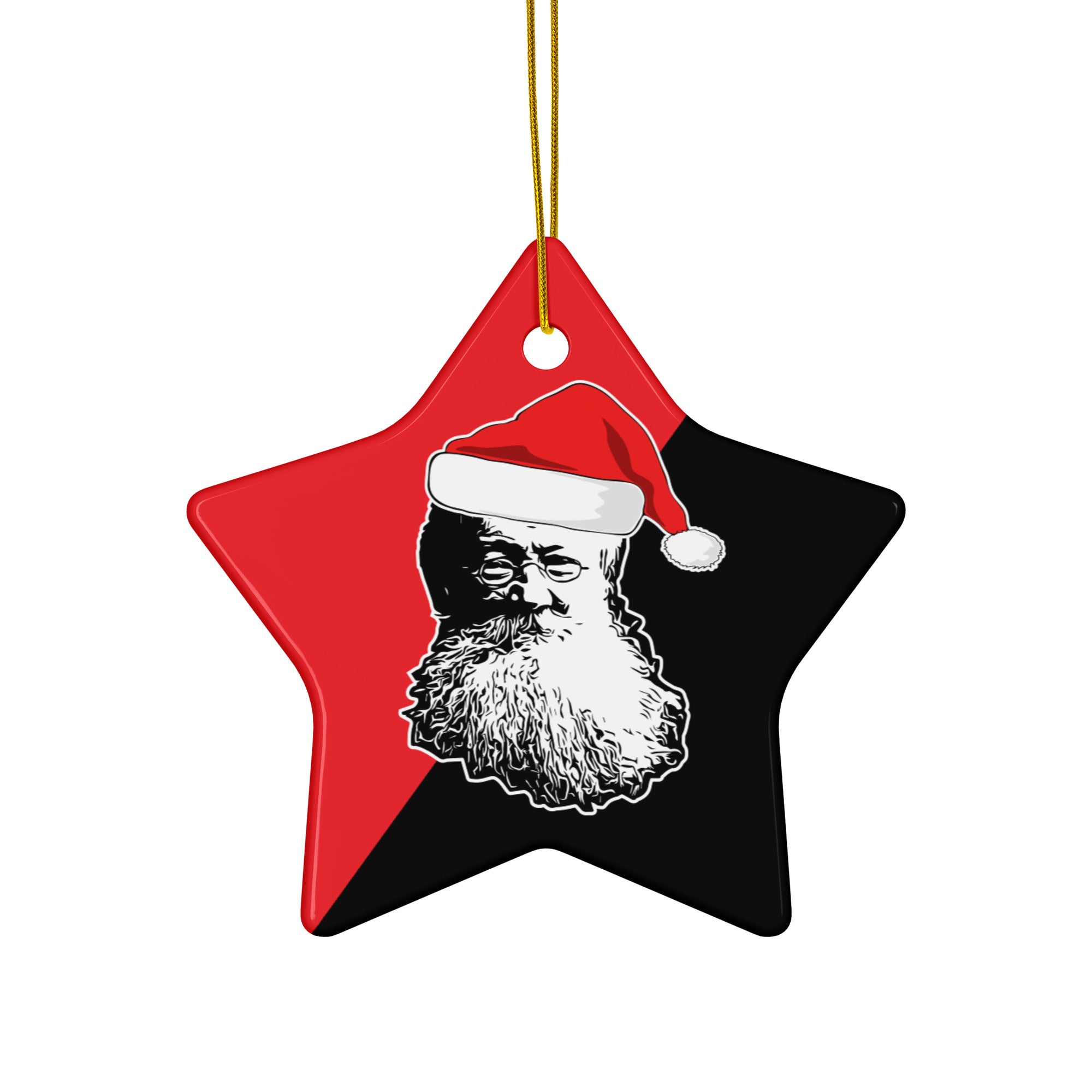 Decorate your Christmas tree with these festive ceramic ornaments printed on one side with anarchist communist colours and Peter Kropotkin (known as "Bread Santa") as Santa. With a smooth, glossy finish and gold-toned string.