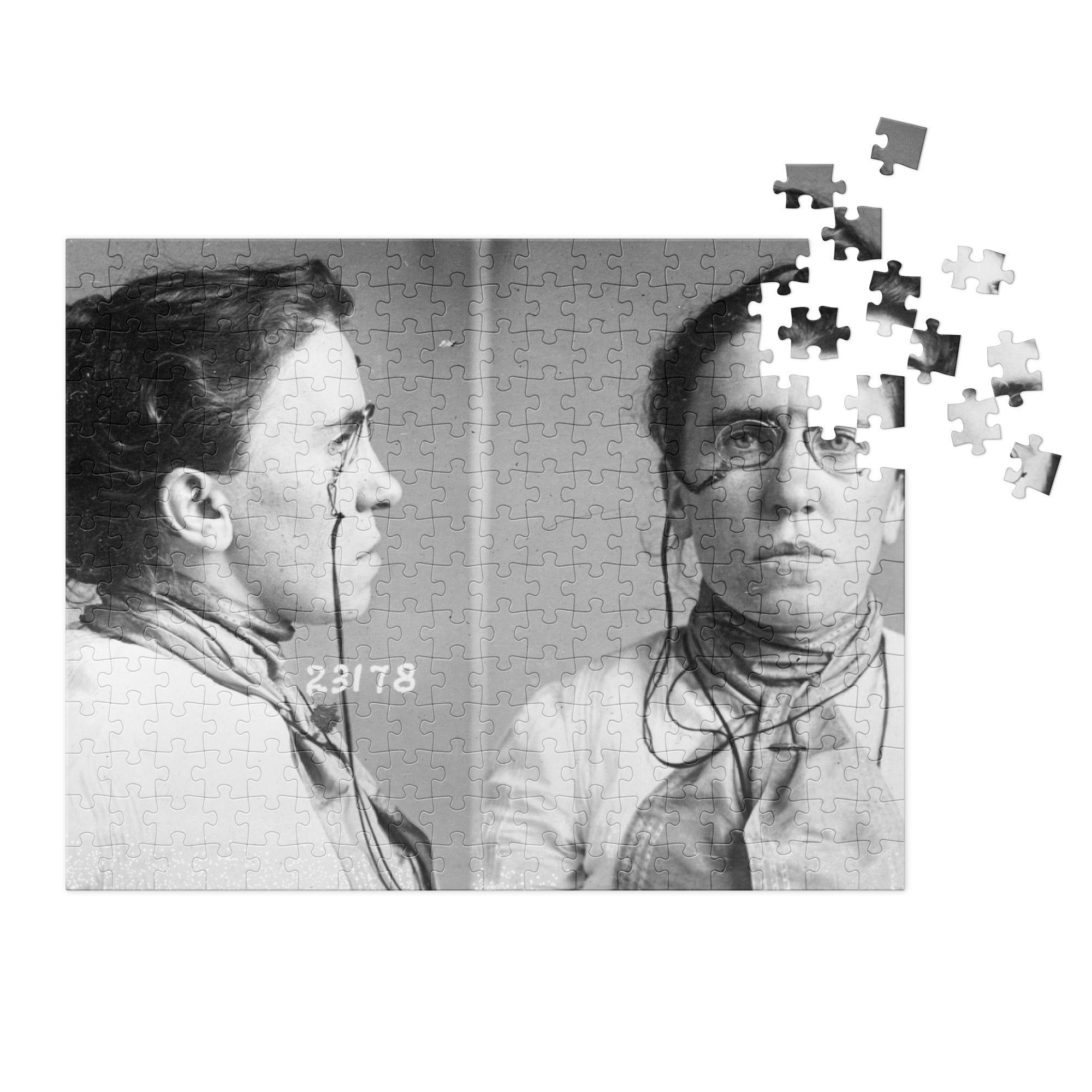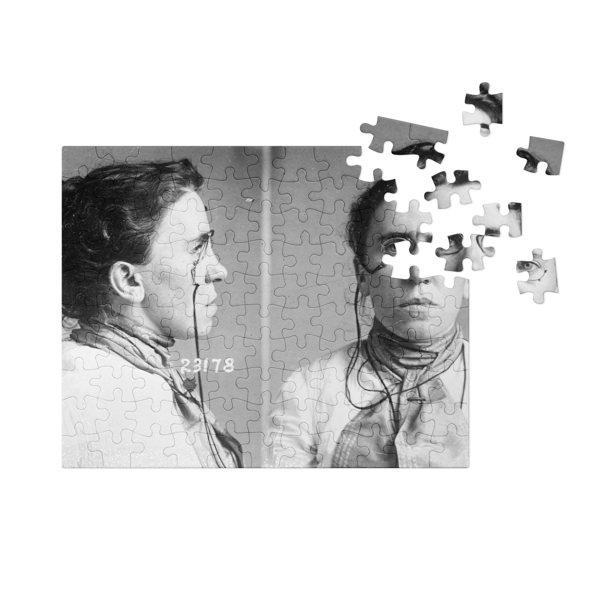 A glossy, vibrant jigsaw puzzle packed in a stylish tin box, depicting the mug shots taken of legendary Lithuanian-born Jewish anarchist Emma Goldman after her arrest in 1901 in connection with the assassination of President McKinley.