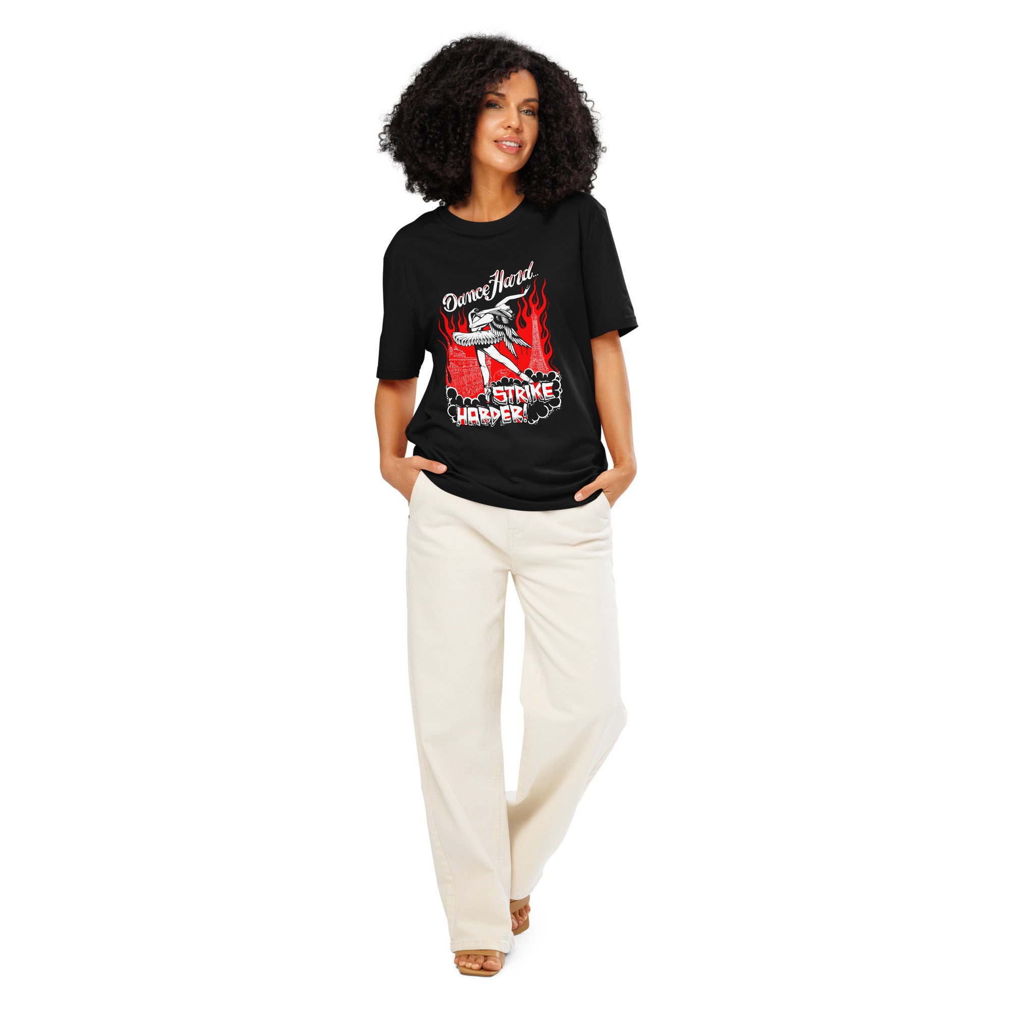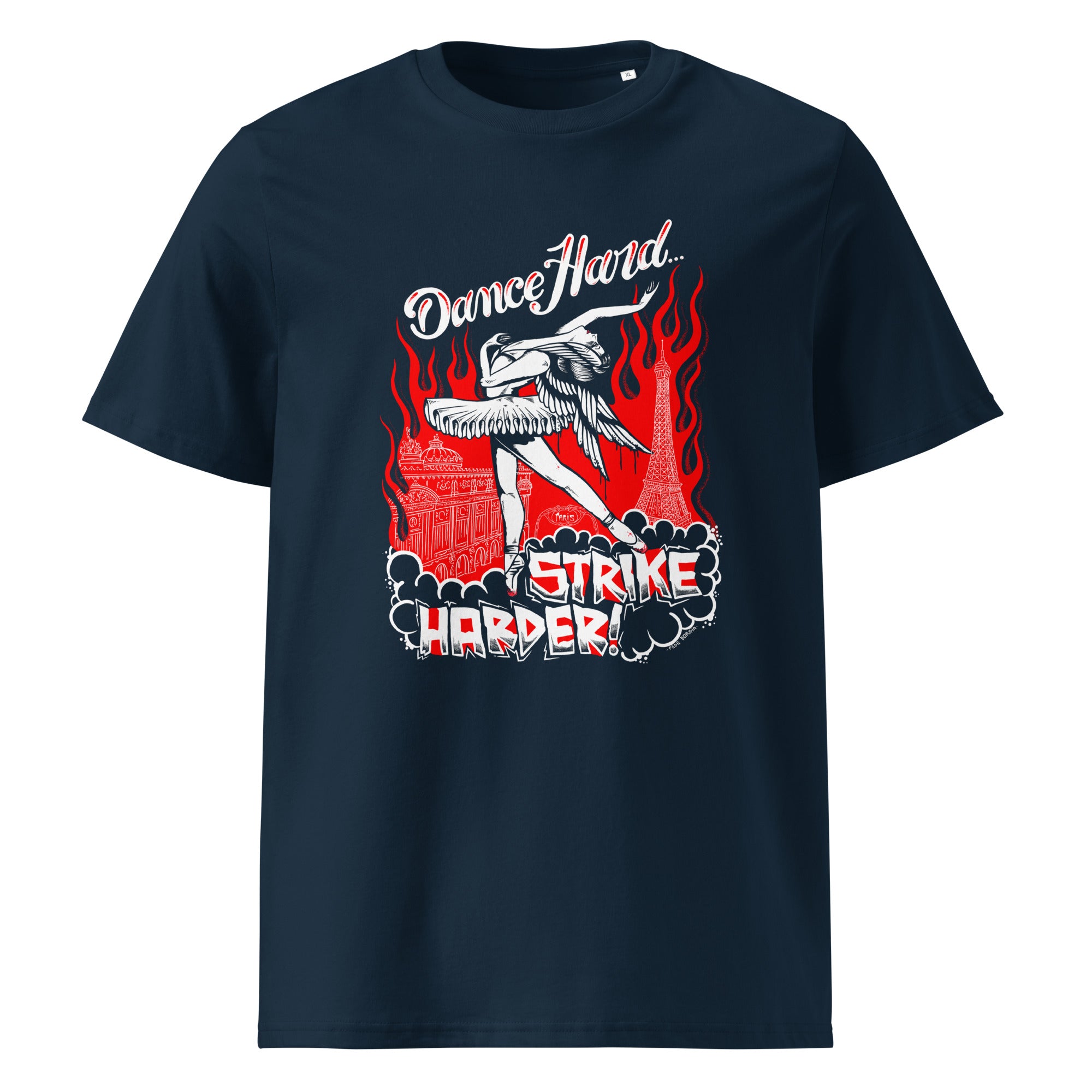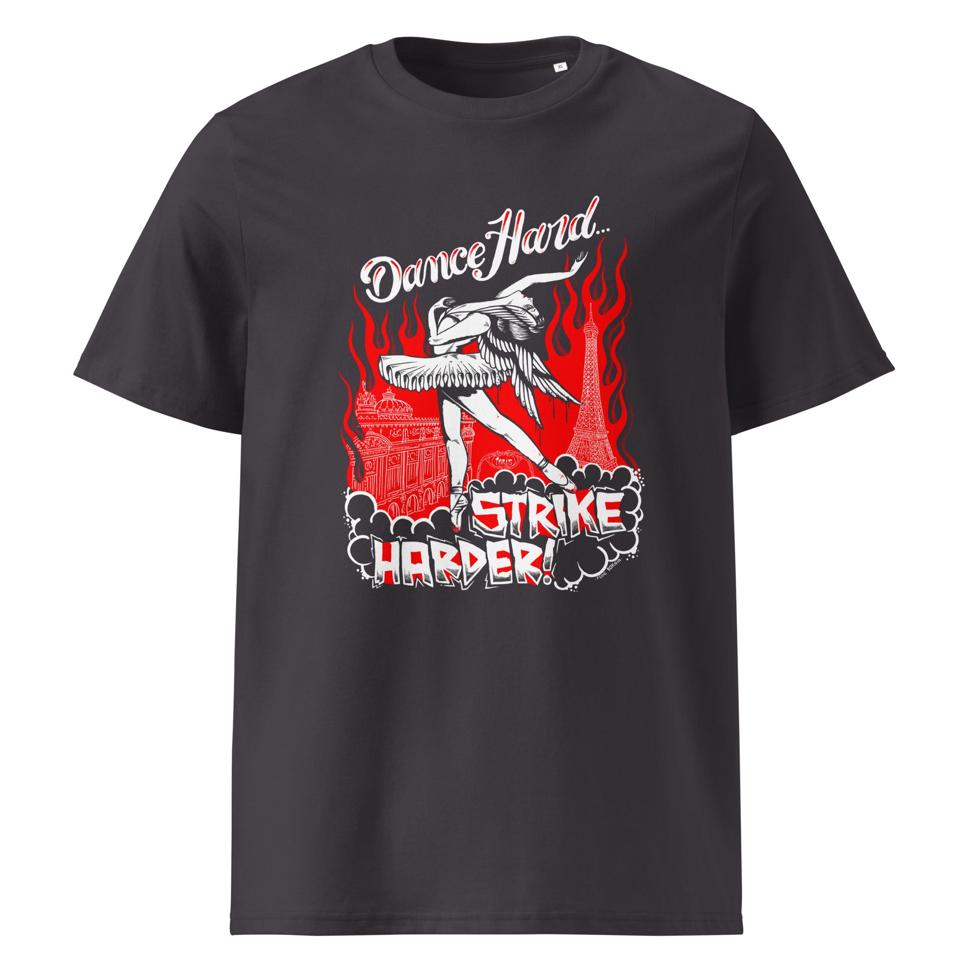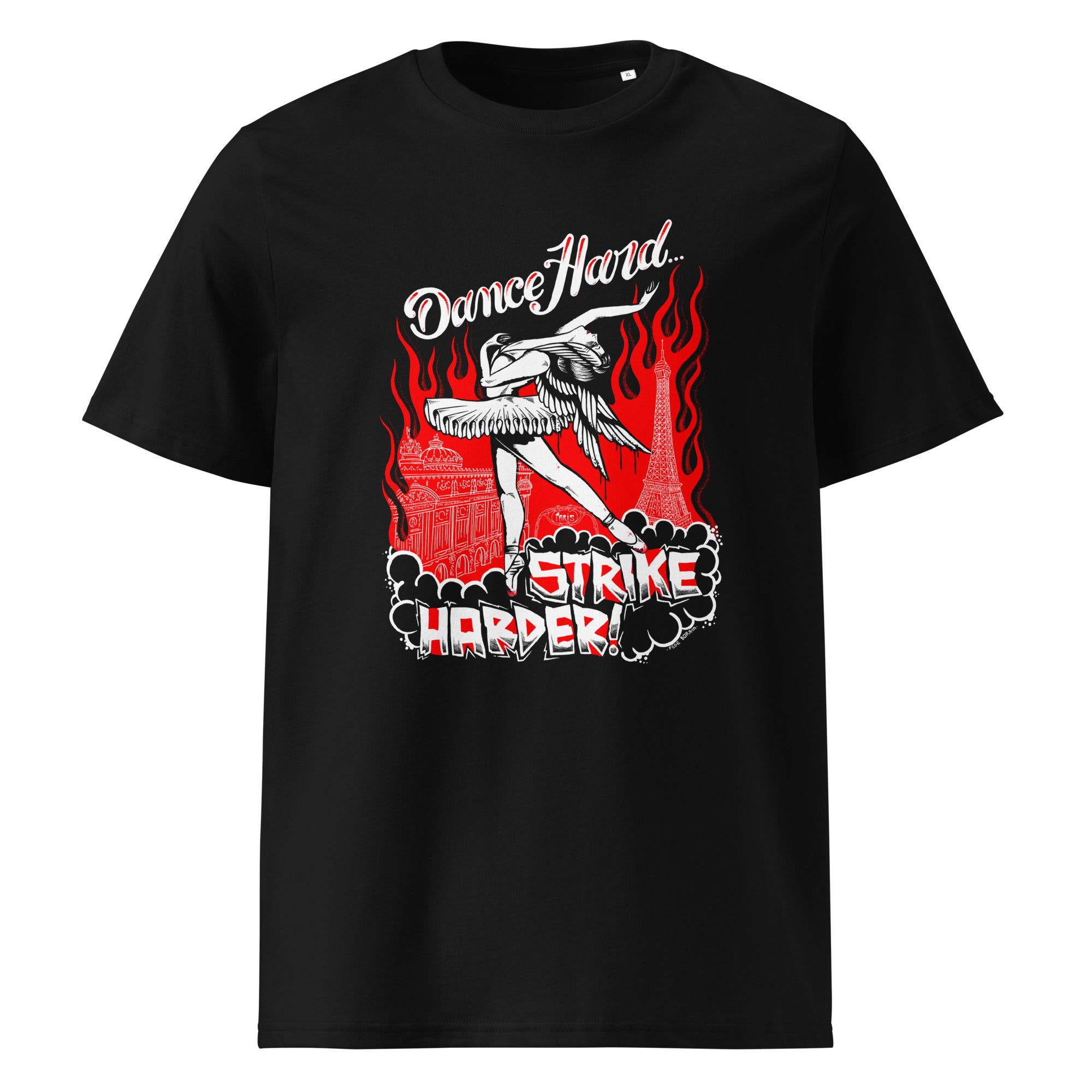 Design by Italian tattooist Fede Borgia celebrates the beautiful, courageous and above all successful protest of the Paris ballet dancers with the powerful slogan "Dance Hard ... Strike Harder!". It displays one of the striking dancers in a typical Black Swan costume and in the background there is the Eiffel Tower and the Opéra Garnier.