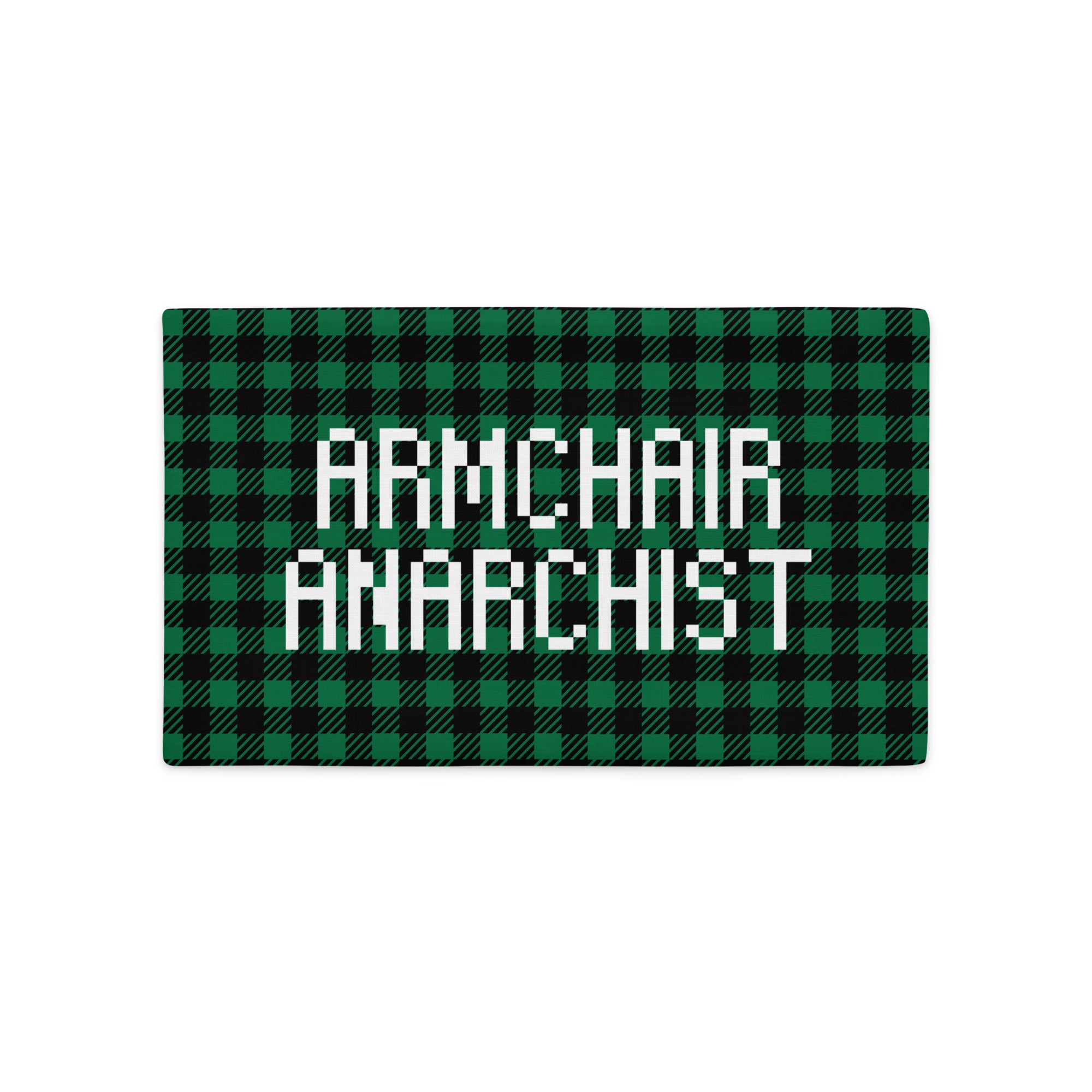 Premium feel zipped pillow/cushion case, on a green and black check design, for armchair anarchists, or anarchists' armchairs (or sofas or beds)! This product is only the pillowcase - pillow filling not included. Also available with pillow filling, or in red and black.