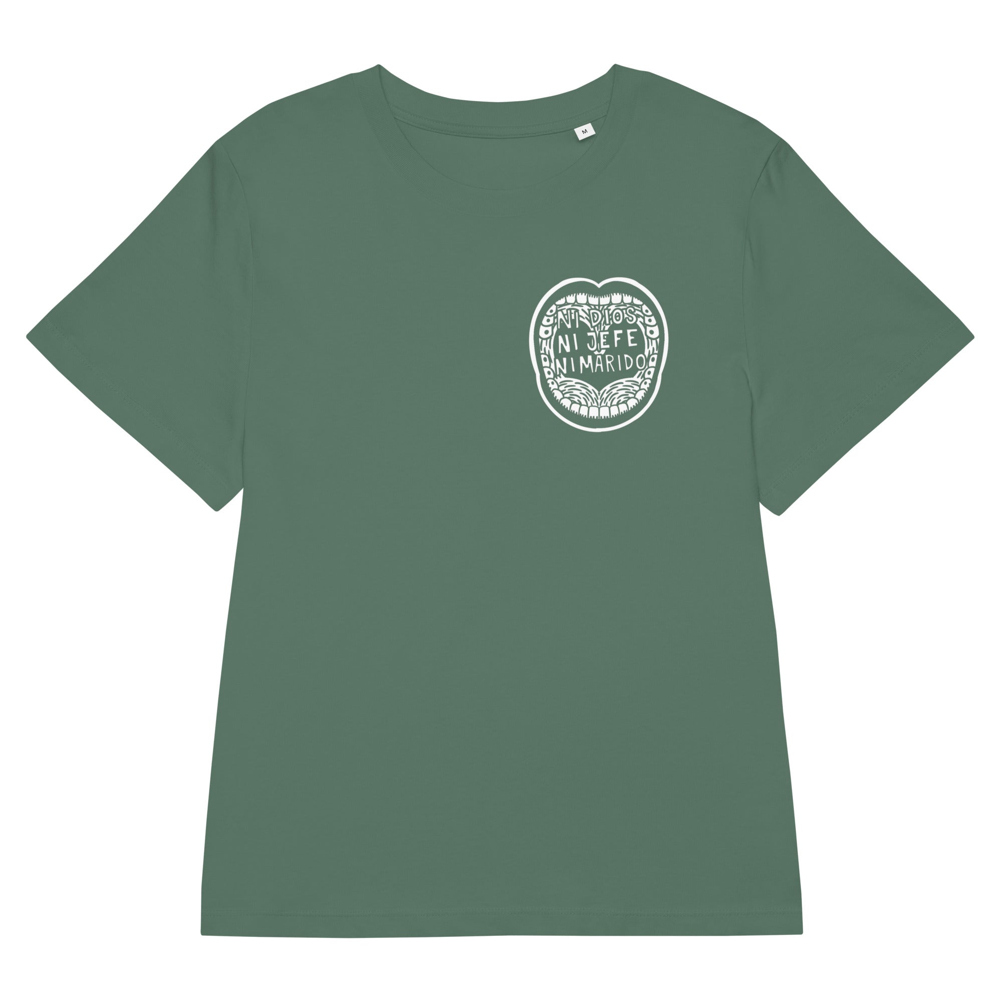 Design by Buenos Aires-based artist and tattooist, Meri Prodan aka Poxi, represents these brave women's fight by incorporating their newspaper's name "La Voz de la Mujer" into a drawing of an angry woman's face. The back print is complemented by a smaller, more subtle front print showing the same woman's mouth saying “Ni Dios, Ni Jefe, Ni Marido” ("No God, No Boss, No Husband"), one of the slogans used by the women behind the newspaper at the time.