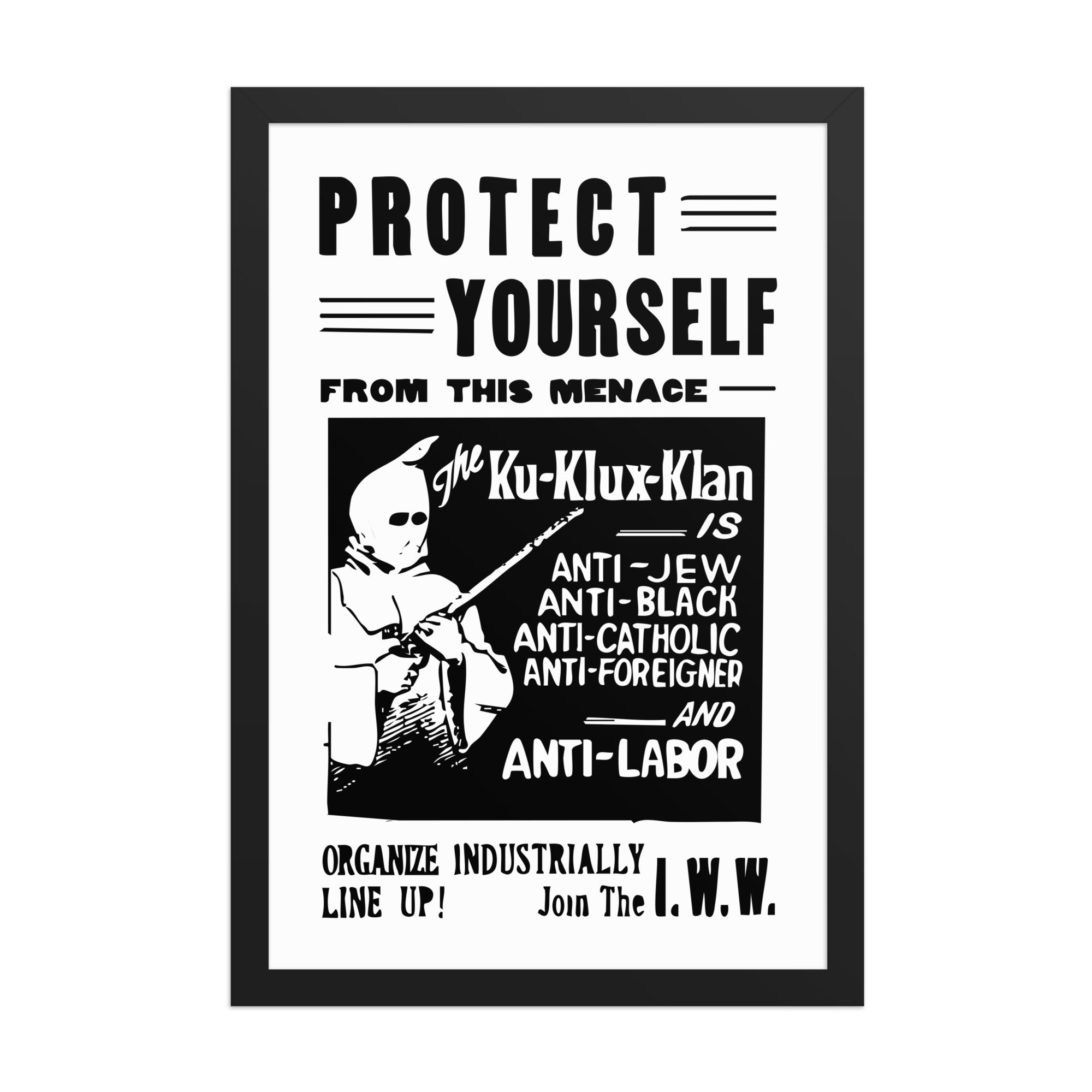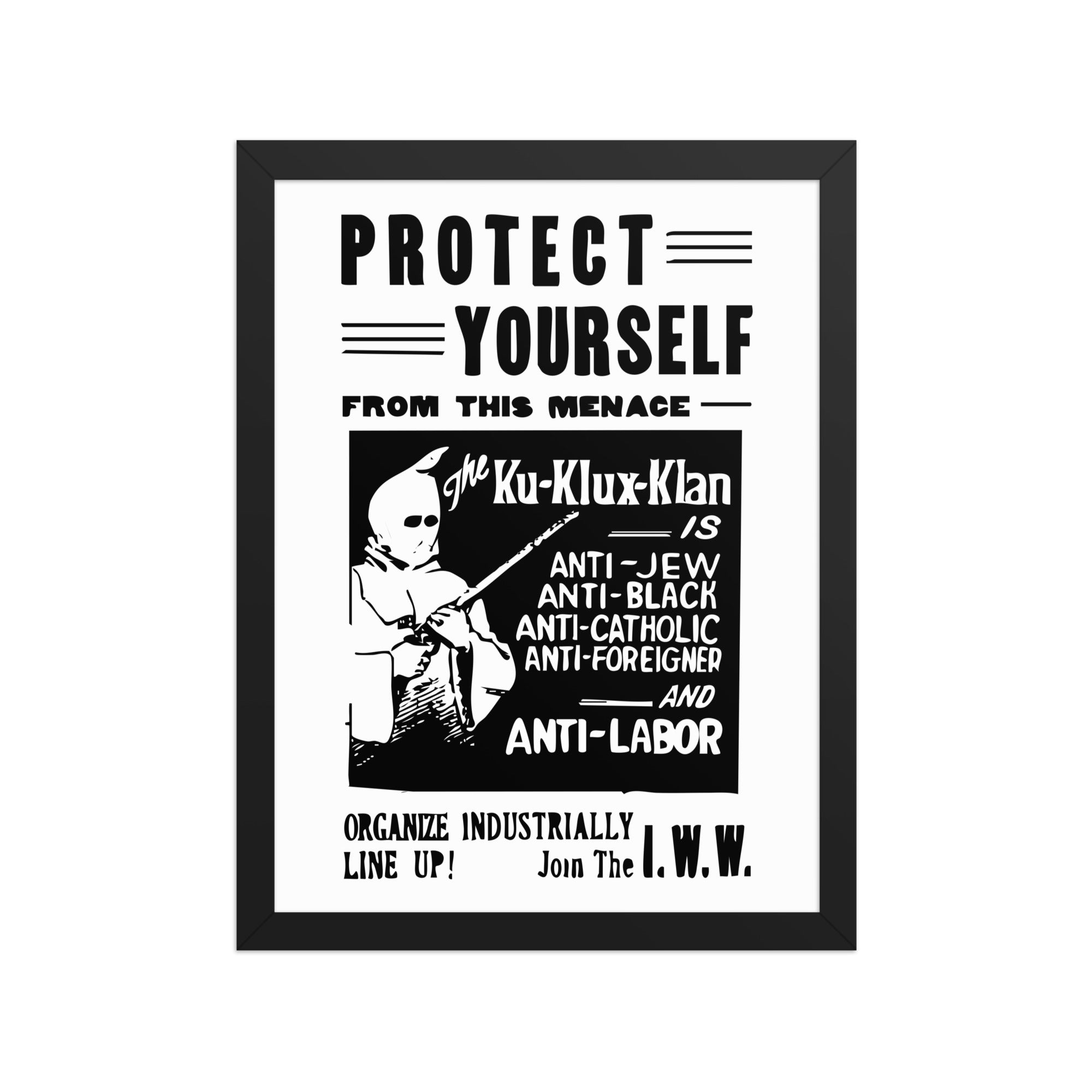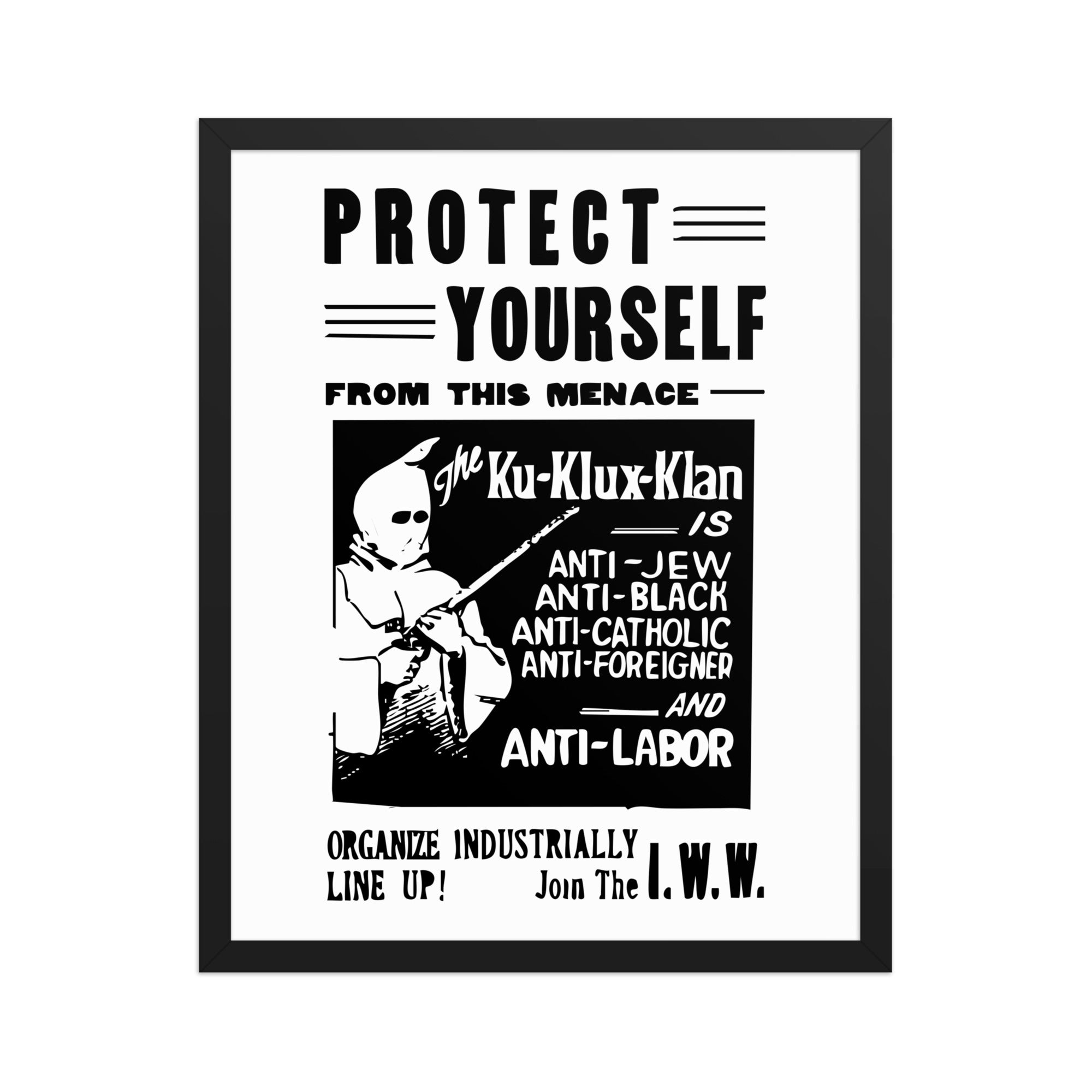 Framed poster, printed on thick matte paper with matte black frame that's made from wood from renewable forests. Reproducing a slightly-edited version of a historical poster opposing the KKK produced by the revolutionary Industrial Workers of the World union.