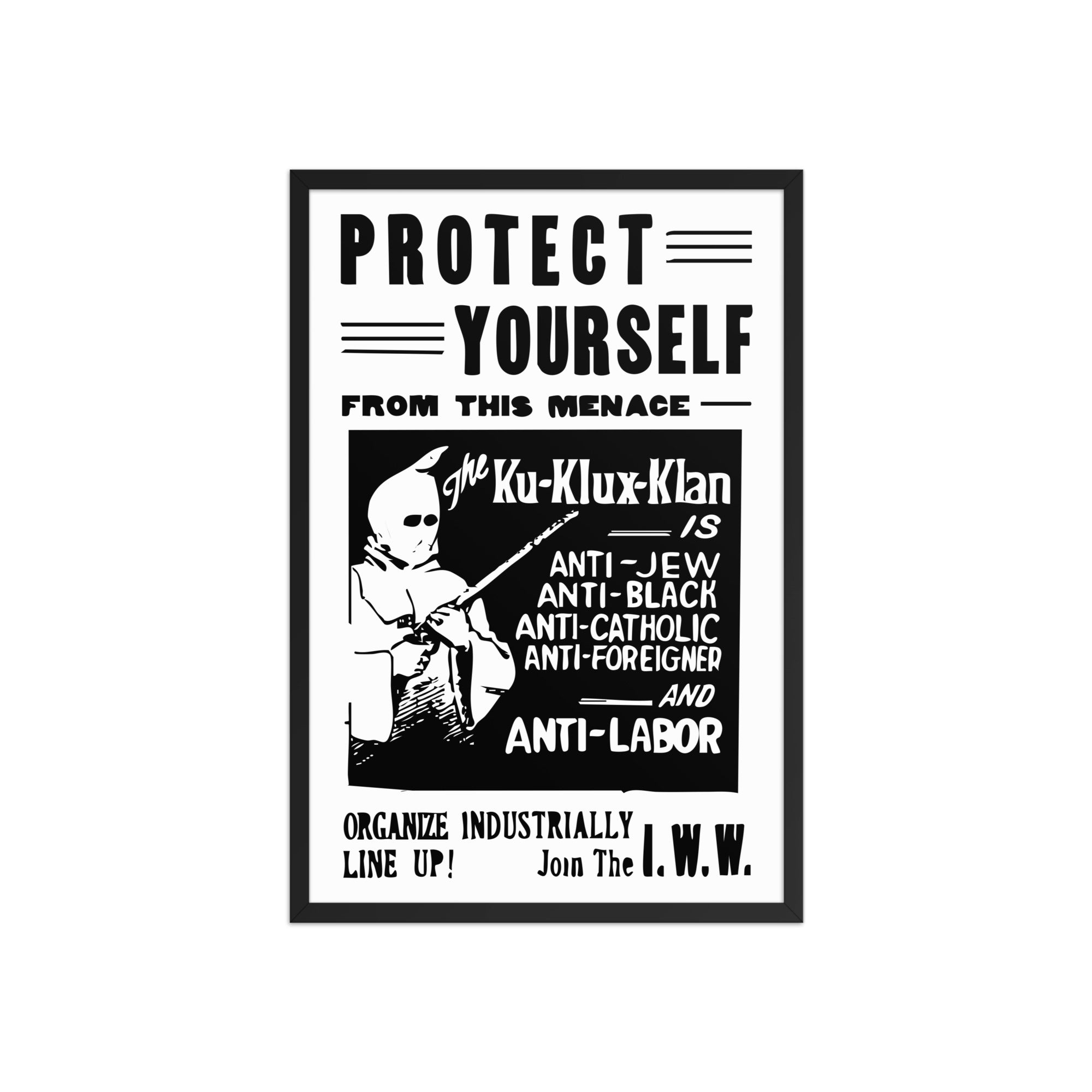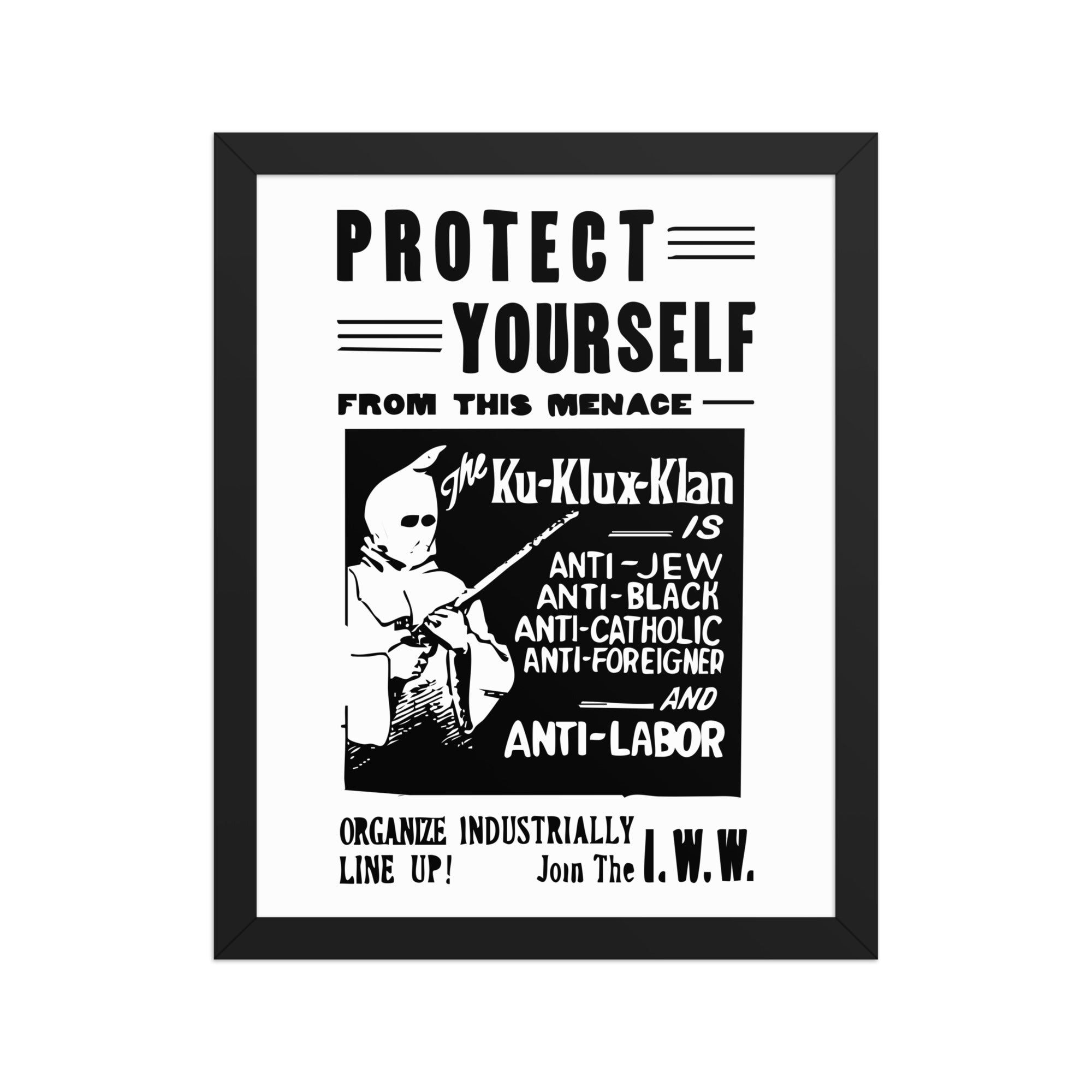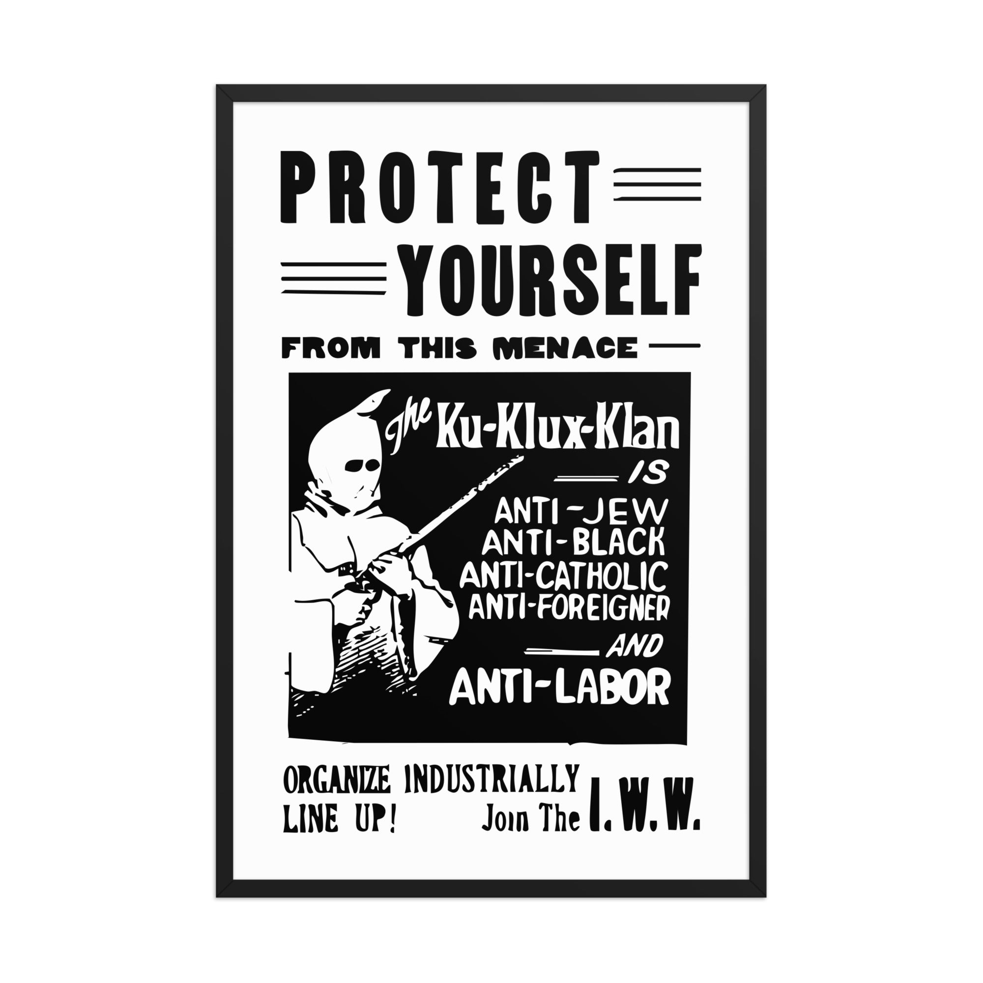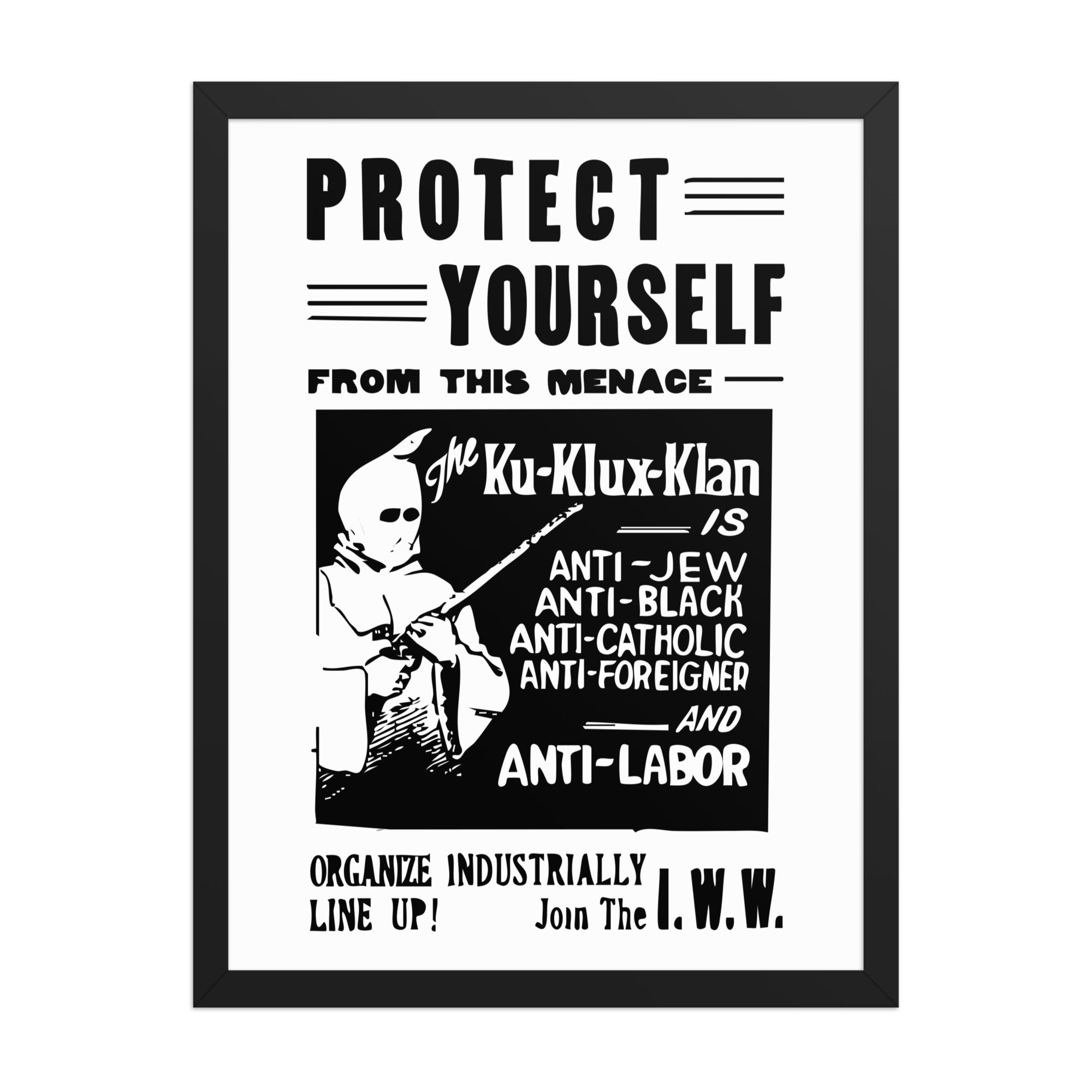 Framed poster, printed on thick matte paper with matte black frame that's made from wood from renewable forests. Reproducing a slightly-edited version of a historical poster opposing the KKK produced by the revolutionary Industrial Workers of the World union.