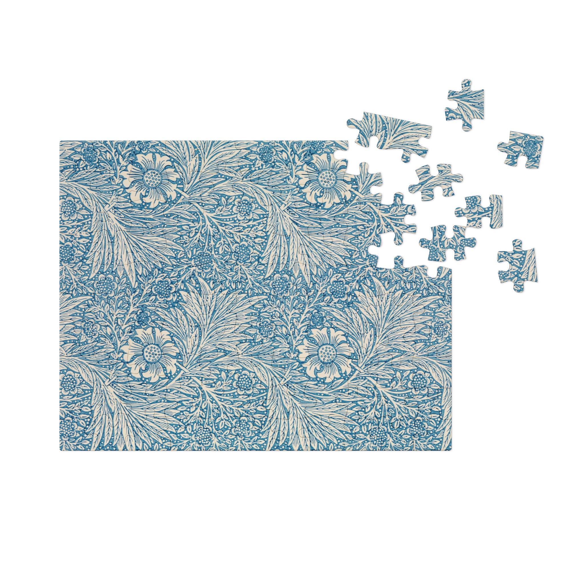 A glossy, vibrant jigsaw puzzle packed in a stylish tin box, with a beautiful marigold print designed by British socialist artist, William Morris, in 1875.
