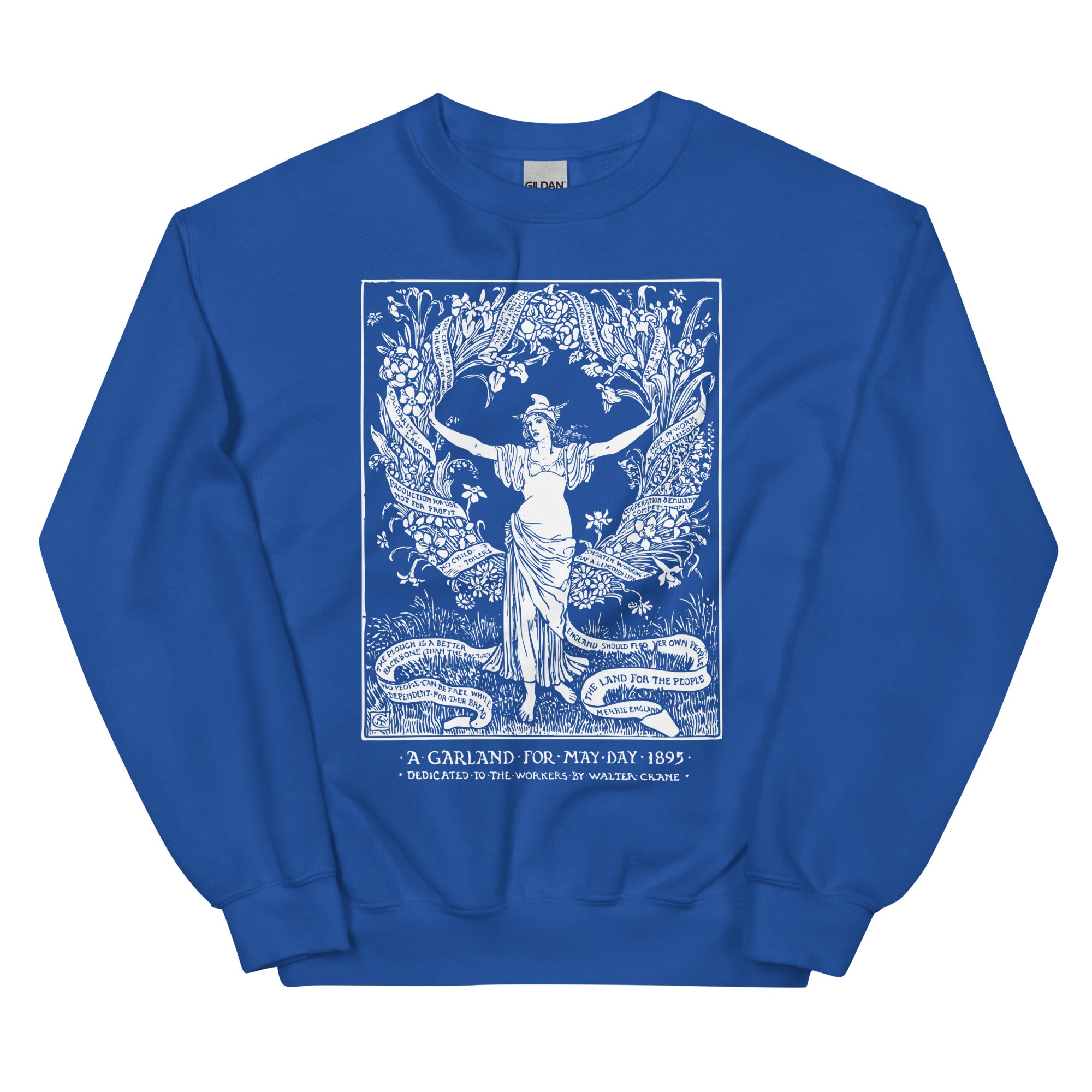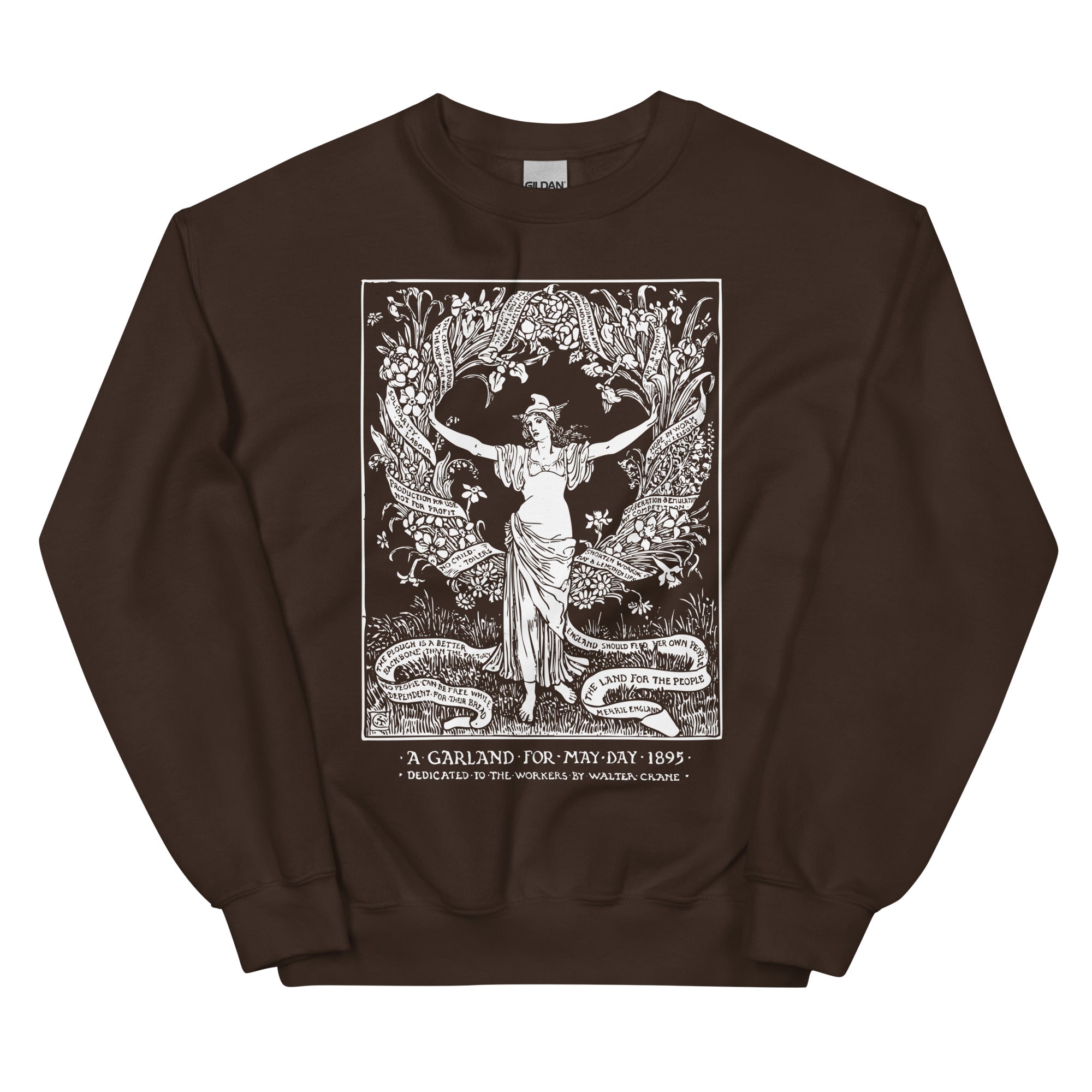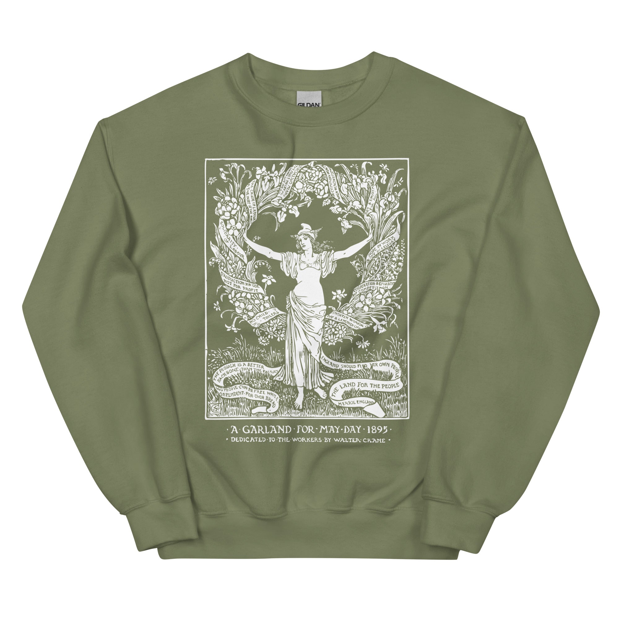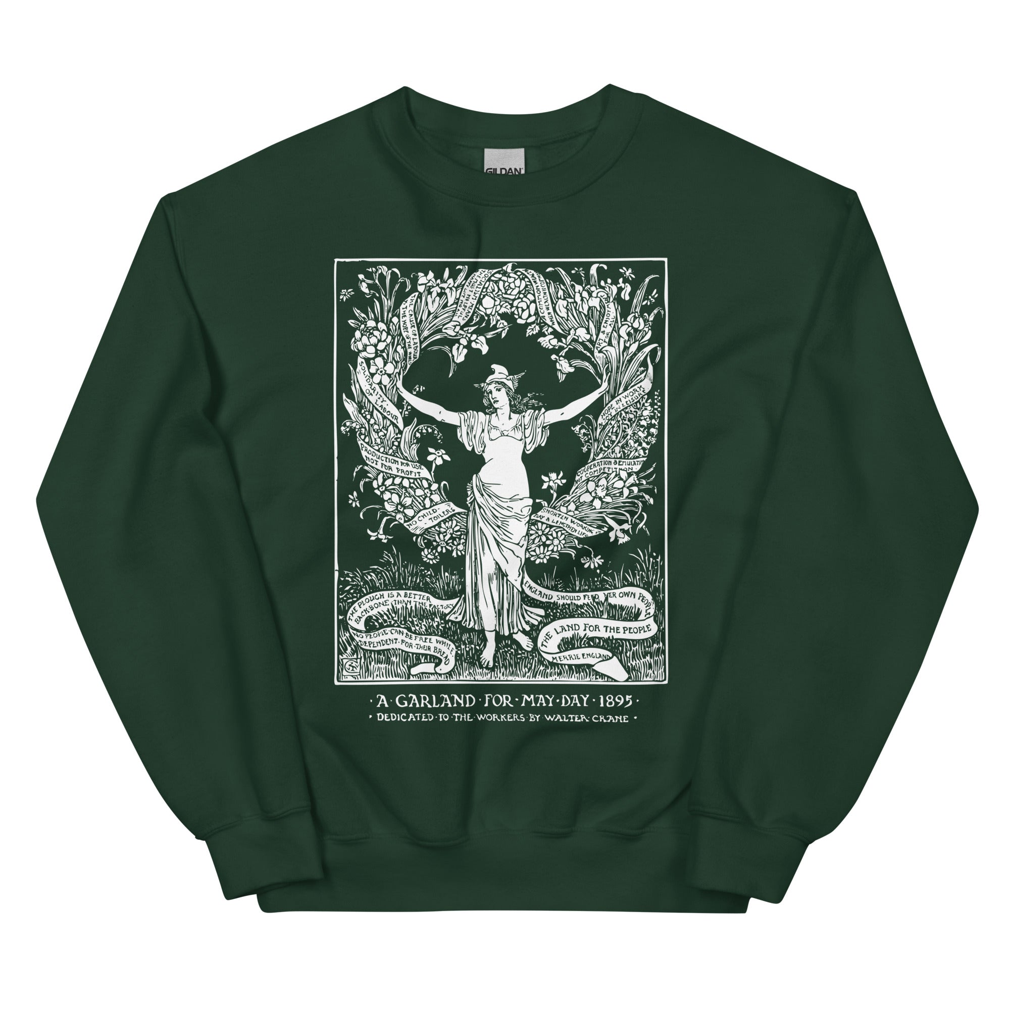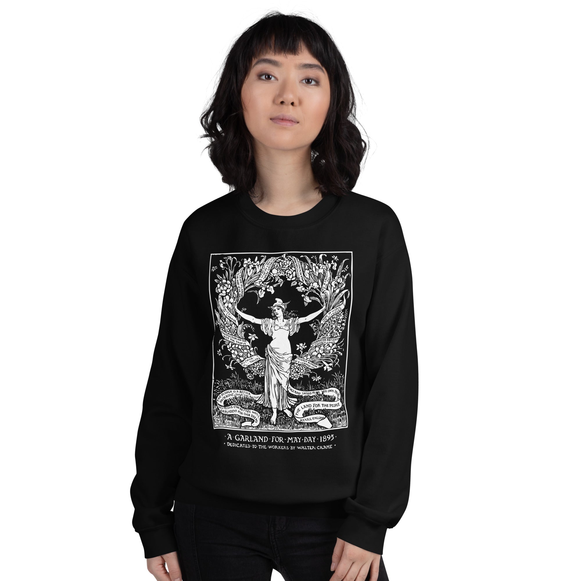 A sturdy and warm, pre-shrunk, classic unisex fit sweater that’s made with air-jet spun yarn for a soft feel. Featuring "A Garland for May Day", a cover design for The Clarion for 1 May 1895 by British artist Walter Crane. Floral and leafy garlands were part of traditional May Day celebrations in England, which date back hundreds of years. After the executions of the Haymarket martyrs in Chicago for fighting for the 8-hour day, 1 May was declared to be International Workers' Day by socialist organisations around the world, and this garland merges both traditions.
